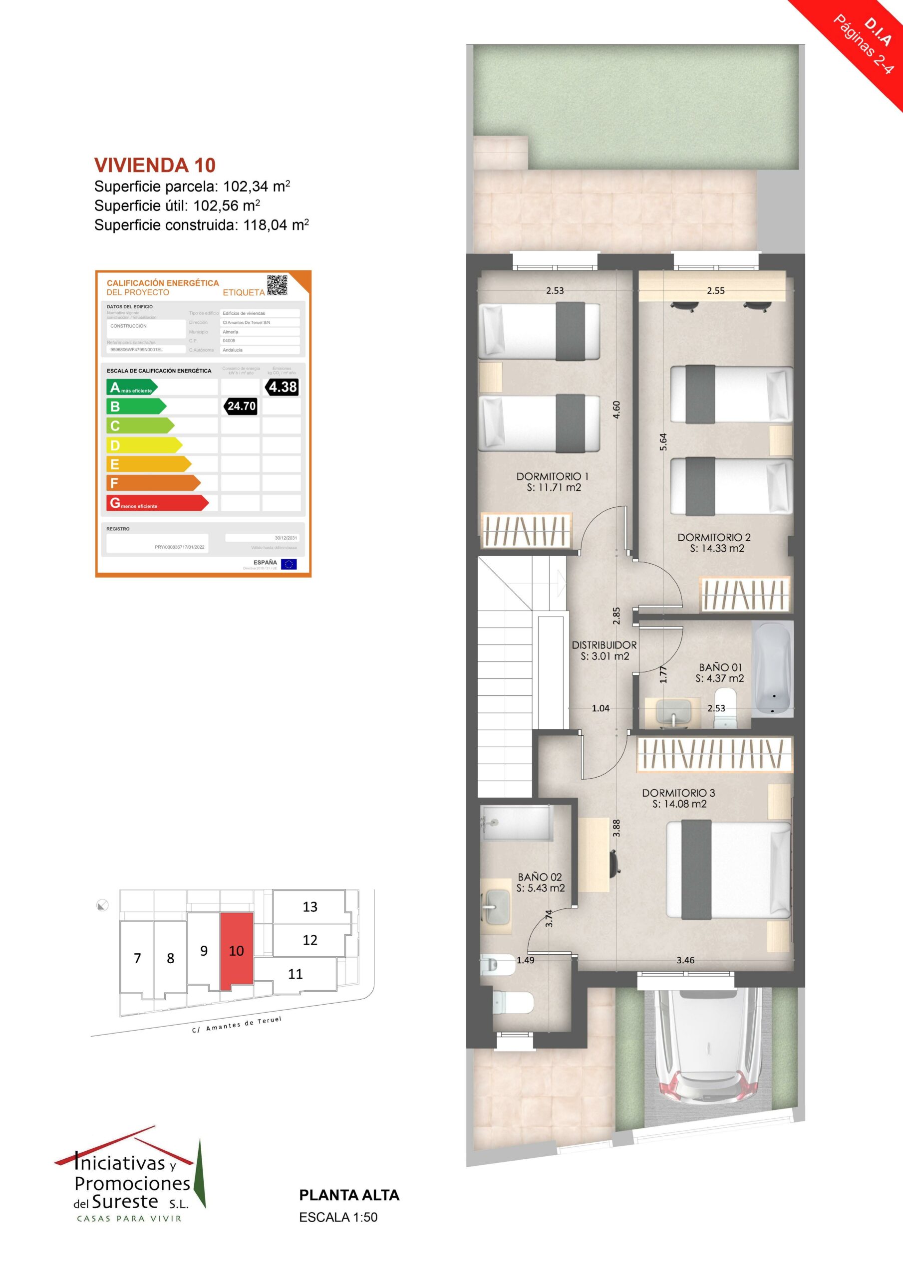 7 viviendas construidas en C/Amantes de Teruel y C/ Bajo Aragón, Almería. Calificación Energética A y B. El promotor ajustará su actuación y contratación al cumplimiento de los requisitos establecidos en la Ley 38/1999. El consumidor tiene derecho a copia del Documento Informativo Abreviado y a cualquier información adicional en C/Rueda López, 12, 3ºB, Almería. Promueve Iniciativas y Promociones del Sureste, S.L., Registro Mercantil Madrid, To6823, Fo186, Hoja M-111133, CIF B80688914.